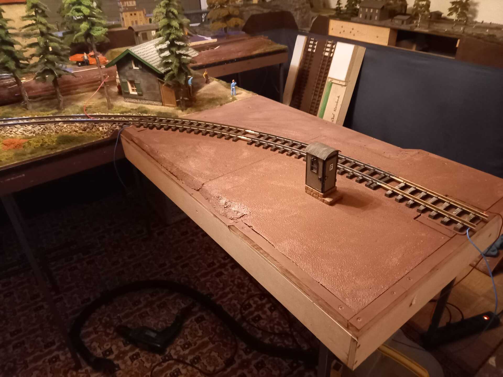 Lasset den Aufbau auf den Modulen beginnen. Nach dem gestrigen Bild der nächste Schritt. Ihr habt gestern im Törchen gesehen, dass Johannes einige Markierungen als Orientierung auf die neuen Module gezeichnet hat. Hier ist er doch tatsächlich schon wieder einen Schritt weiter. Die ersten Aufbauten sind befestigt. Deutlich erkennbar, dass die Übergänge zu den anderen Modulen angepasst werden und auch ein breites Gleisbett das neue Modul durchziehen wird.