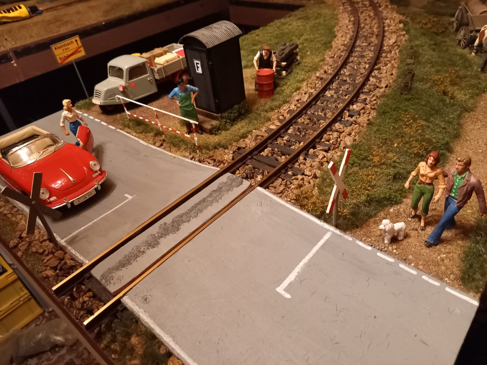 Wir wissen nicht, was unser Herbert den Pressevertretern zum Nagetierproblem auf Helmuts Modulen erzählt hat (wir berichteten jetzt drei Tage lang), aber die Aufregung ist abgeklungen. Dann können wir uns nochmal Johannes und seiner LGB widmen. Die Kurve aus dem Türchen 14 soll noch einen Bahnübergang erhalten. Den Grundstein hat unser Vorsitzender hier gelegt. Aber eigentlich müsste man sagen, das Grundholz hat er gelegt (und befestigt).