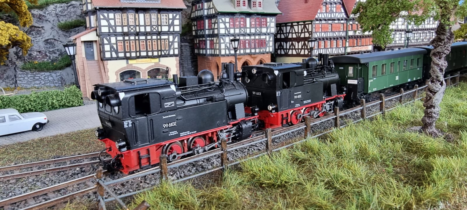 Schmuckes Beiwerk braucht natürlich jede Modellanlage auch. Besonders beliebt sind dabei Bäume. Wenn Johannes aber loslegt und Bäume in reiner Handarbeit herstellt, dann ist der Begriff "Beiwerk" schon fast eine Beleidigung. Die meisten Bäume auf den Anlagen des MECW stammen aus seiner Produktion und sind solche Hingucker, dass wir immer wieder angesprochen werden, wo wir diese denn erwerben. Nirgends lautet die für viele verblüffende Antwort. Als wir mit unserer H0-Anlage 2018 in der KölnMesse zu Gast waren, entwickelten sich die Basteleien von neuen Bäumen fast schon zu einem Workshop für viele Besucherinnen und Besucher. Auch dieser Baum ist einmal mehr ein Kunstwerk, diesmal in "Gartenbahn"-Größe statt H0.