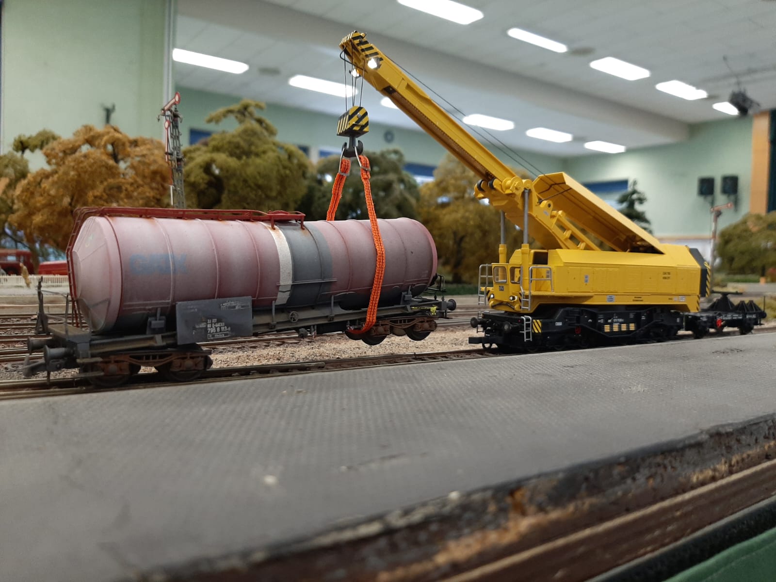 Stark mitgenommen war dieses Modul von unserem Mitglied Helmut. (Übrigens: rechts im Bild seht ihr auch Teile seiner heimischen Gartenbahn). Es handelt sich bei dem in Mitleidenschaft gezogenem Modul um eines, seines US-Amerikanischen-Bahnbetriebswerkes. Nicht nur in unseren Clubräumen stand das Hochwasser im Sommer, sondern auch über Helmuts private Module in der Eifel. Und weil heute der "Nikolaustag" ist, bekommt ihr auch etwas besonderes. Zwei Bilder. Ihr sehr nämlich auch, dass dieses Modul gerettet werden konnte. Nach intensiver Arbeit erstrahlt es mit den anderen drei (ebenfalls von Johannes und Helmut) geretteten Modulen des Betriebswerkes neu.